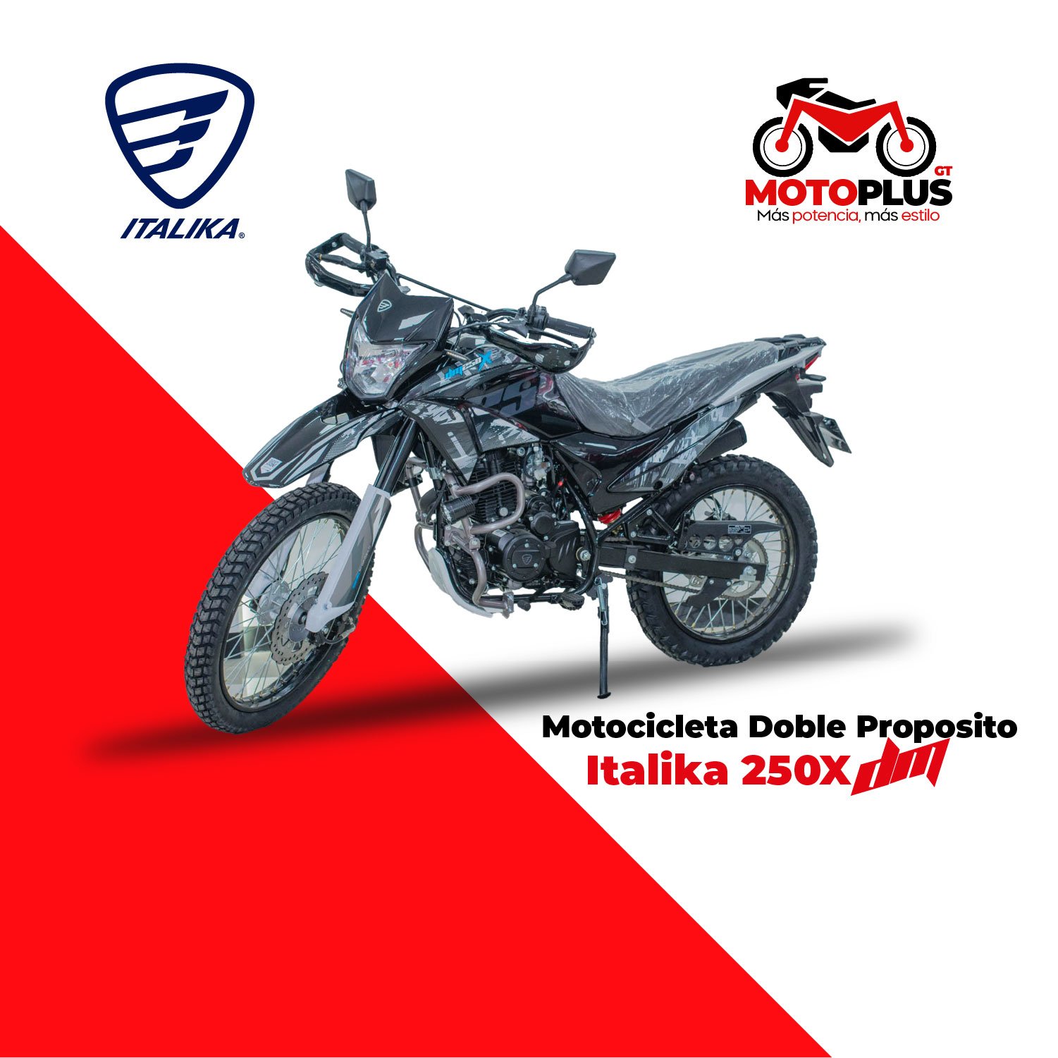 La Italika DM250X es una motocicleta doble propósito con motor de 250 cc, pensada para quienes necesitan una moto versátil que funcione tanto en ciudad como en caminos mixtos o rurales. Su construcción robusta y suspensión adecuada permiten comodidad y control al transitar terrenos irregulares, mientras que su diseño moderno conserva un estilo urbano práctico. Gracias a su potencia y su estructura resistente, la DM250X es una opción ideal para quienes buscan una moto confiable, capaz de adaptarse a distintas condiciones de manejo, combinando utilidad y rendimiento en un solo vehículo.